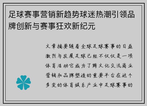 文章摘要:随着全球足球赛事的日益激烈与发展,足球已经不仅仅是一项体育活动,它成为了跨文化交流、商业营销和品牌塑造的重要平台。在这个多变的体育娱乐产业中,足球赛事的营销策略和球迷热潮已逐渐引领着品牌创新...