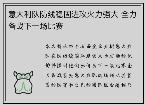 本文将从四个方面全面分析意大利队在防线稳固和进攻火力方面的优势,并探讨他们如何为下一场比赛全力备战。首先,意大利队的防线以其坚固的防守和出色的团队配合著称,而在进攻端,球队依靠灵活的战术体系和多点开花...