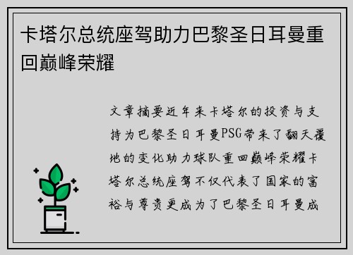 文章摘要:近年来,卡塔尔的投资与支持为巴黎圣日耳曼(PSG)带来了翻天覆地的变化,助力球队重回巅峰荣耀。卡塔尔总统座驾不仅代表了国家的富裕与尊贵,更成为了巴黎圣日耳曼成功背后的象征。本文将从四个方面探...