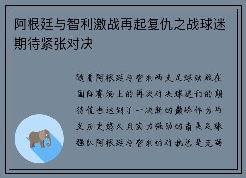 随着阿根廷与智利两支足球劲旅在国际赛场上的再次对决,球迷们的期待值也达到了一次新的巅峰。作为两支历史悠久且实力强劲的南美足球强队,阿根廷与智利的对抗总是充满着激烈的竞争与悬念。尤其是在阿根廷近期的复仇...
